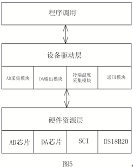 采集板數(shù)據(jù)驅(qū)動程序包括AD采集模塊、DA輸出模塊、冷端采集模塊、通訊模塊等,不同的模塊在程序中有各自的頭文件和源文件,采用模塊化結(jié)構(gòu)的模塊可以提高代碼的重用率,只要修改少量代碼就可以完成程序的移植,在程序中只需要調(diào)用各公共的接口函數(shù)就能對設(shè)備進(jìn)行操作,這樣一來系統(tǒng)軟件的層次分明,便于維護(hù)和調(diào)試。