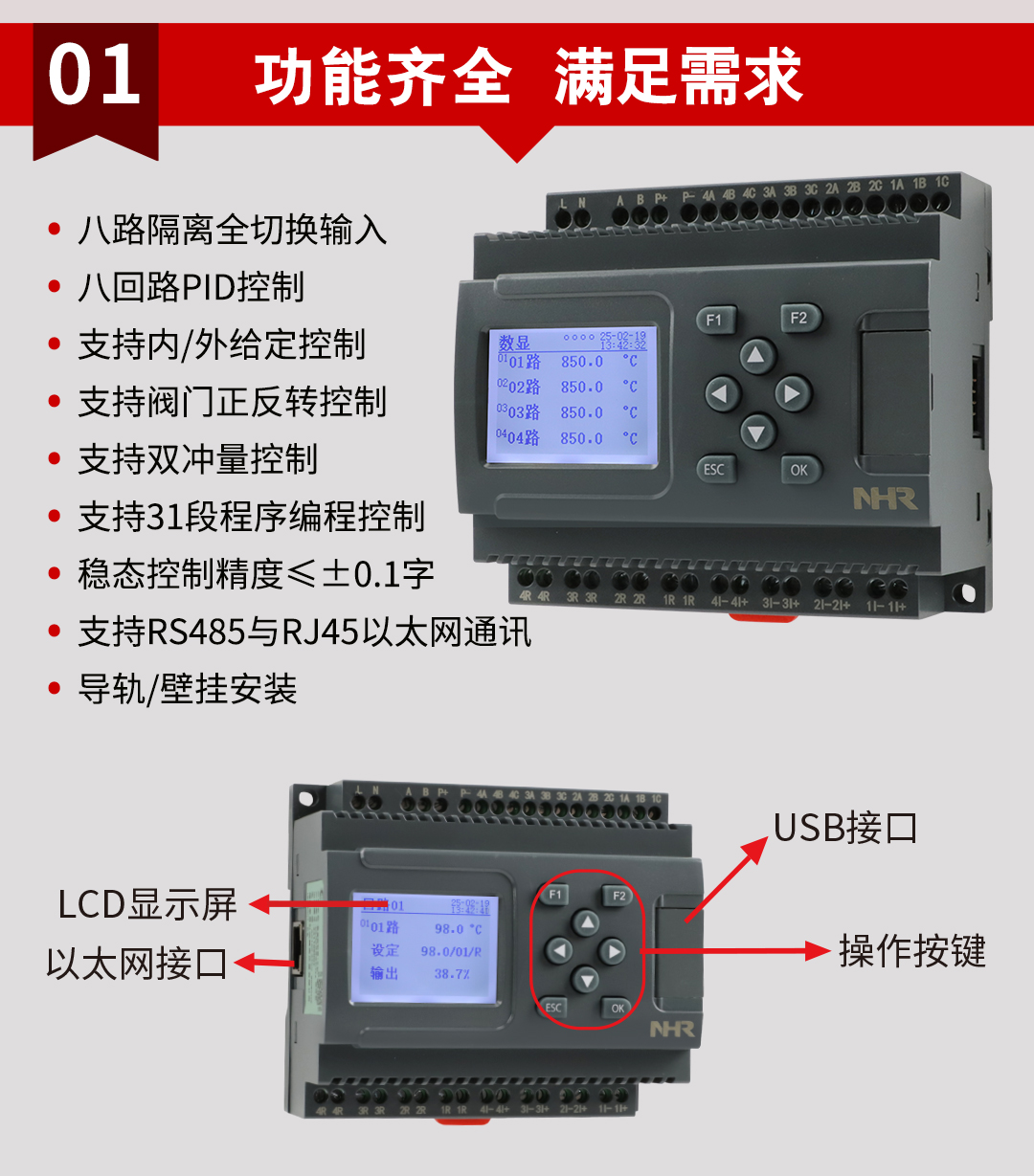 NHR-PR70系列溫度控制器采用真正的人工智能算式,儀表啟動(dòng)自整定功能,可以根據(jù)被控對(duì)象的特性,自動(dòng)尋找最優(yōu)參數(shù)以達(dá)到很好的控制效果,無需人工整定參數(shù)??販鼐然具_(dá)±0.1℃,無超調(diào)、欠調(diào),達(dá)國際先進(jìn)水平??蓭饨o定(或閥位)控制,可取代伺服放大器直接驅(qū)動(dòng)執(zhí)行機(jī)構(gòu);可進(jìn)行編程控制,根據(jù)生產(chǎn)過程的要求,按照一定的程序曲線進(jìn)行控制,最多可分31段曲線對(duì)控制對(duì)象進(jìn)行監(jiān)測(cè)、控制、記錄與遠(yuǎn)傳。