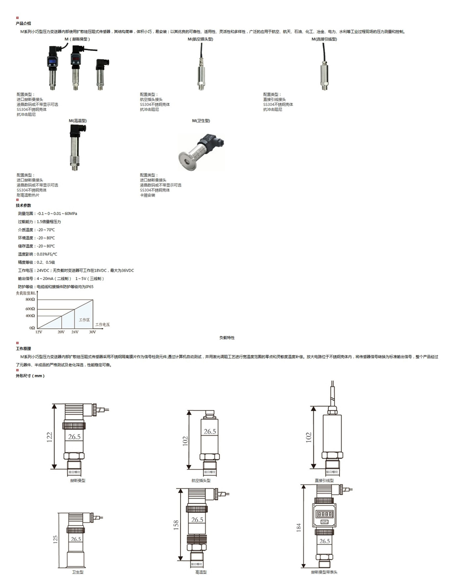 M系列小巧型壓力變送器內部使用擴散硅壓阻式傳感器,其結構簡單,體積小巧,易安裝;以其優(yōu)良的可靠性、適用性、靈活性和多樣性,廣泛的應用于航空、航天、石油、化工、冶金、電力、水利等工業(yè)過程現場的壓力測量和控制。