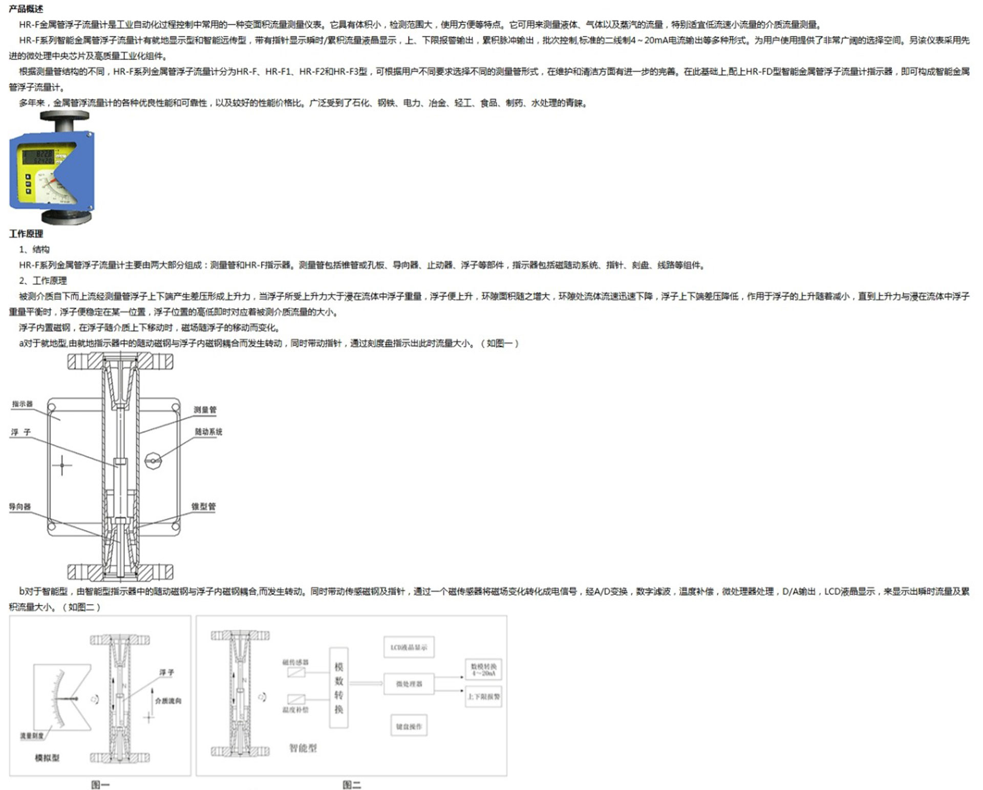 HR-F金屬管浮子流量計(jì)是工業(yè)自動(dòng)化過(guò)程控制中常用的一種變面積流量測(cè)量?jī)x表。它具有體積小,檢測(cè)范圍大,使用方便等特點(diǎn)。它可用來(lái)測(cè)量液體、氣體以及蒸汽的流量,特別適宜低流速小流量的介質(zhì)流量測(cè)量。