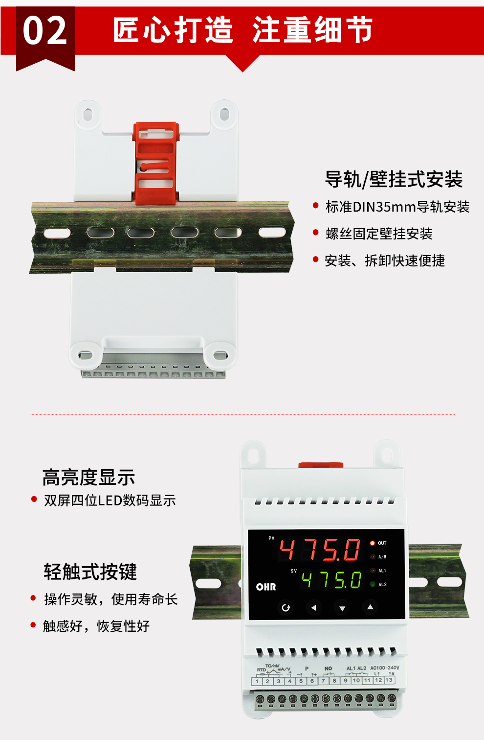 OHR-DN30/DN40系列導(dǎo)軌式智能溫控器/60段程序溫控器采用了表面貼裝工藝,全自動貼片機(jī)生產(chǎn),具有很強(qiáng)的抗干擾能力。本儀表采用人工智能算式,儀表啟動自整定功能,可以根據(jù)被控對象的特性,自動尋找參數(shù)以達(dá)到很好的控制效果,無需人工整定參數(shù),控溫精度基本達(dá)±0.2℃,無超調(diào)、欠調(diào),性價比高。