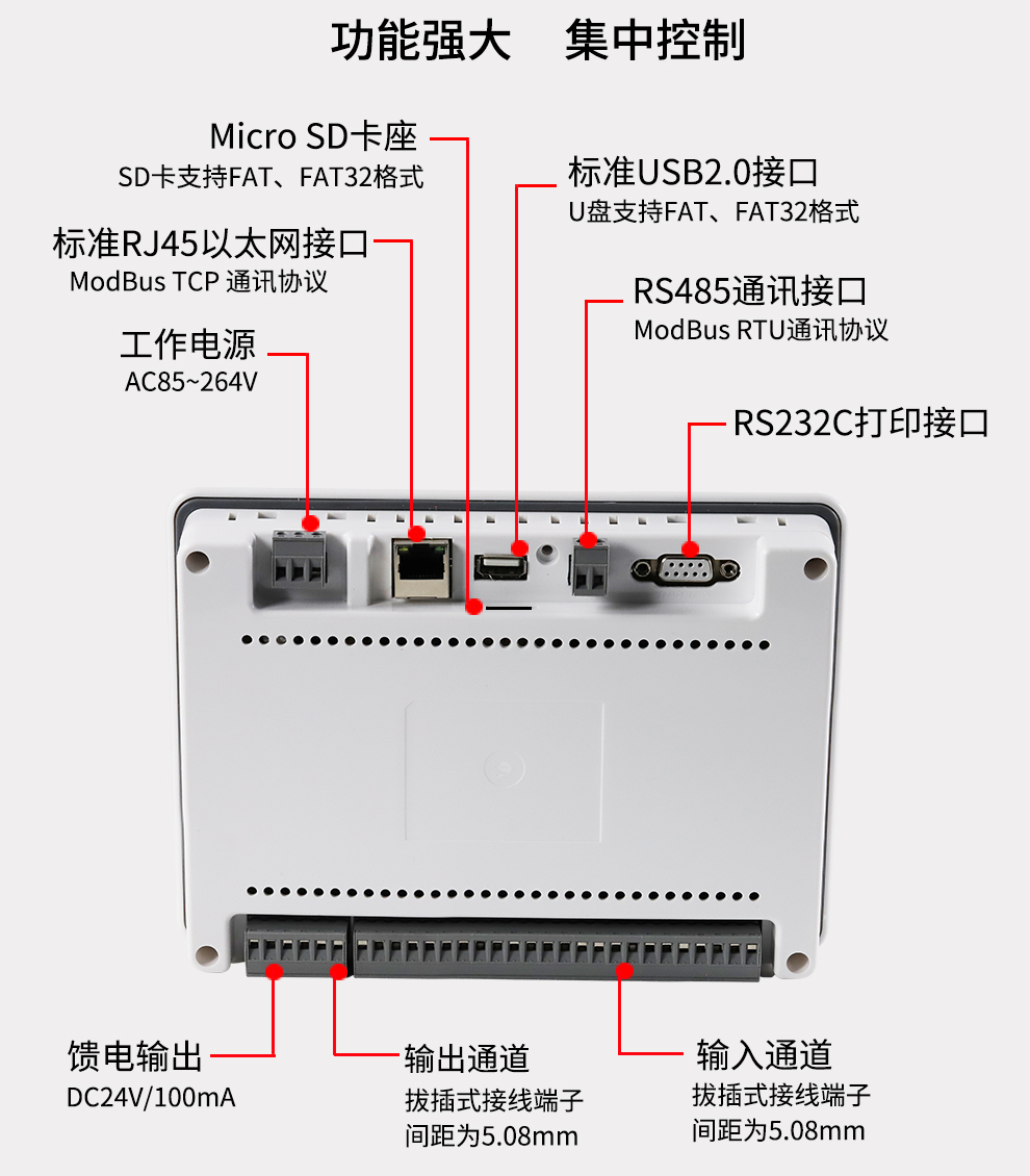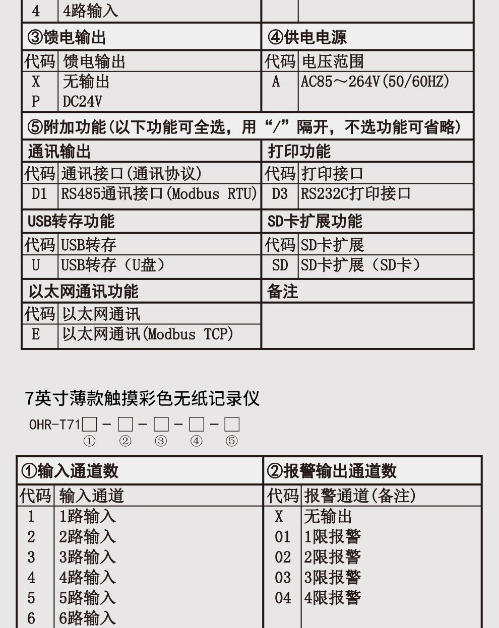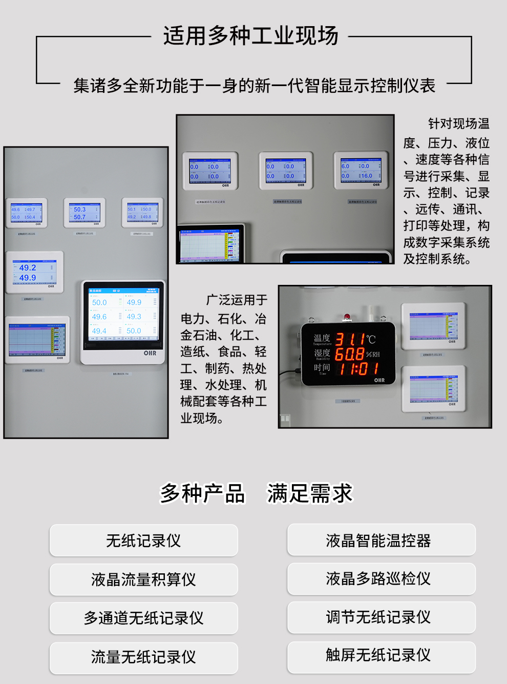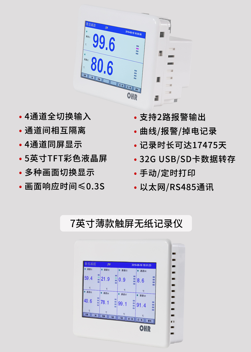 OHR-T系列觸摸超薄無紙記錄儀采用新型大規(guī)模集成電路,對輸入、輸出、電源、信號采取可靠保護(hù)和強(qiáng)抗干擾設(shè)計。8路萬能信號輸入(可組態(tài)選擇輸入:標(biāo)準(zhǔn)電壓、標(biāo)準(zhǔn)電流、熱電偶、熱電阻、頻率、毫伏等)??蓭?路報警輸出,1個饋電輸出,RS485通訊接口,以太網(wǎng)接口,微型打印機(jī)接口和USB接口,SD卡插座。