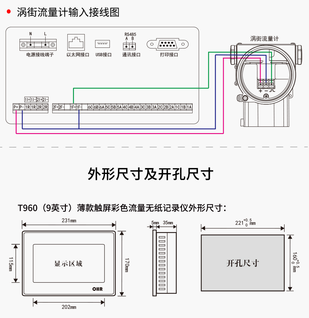 OHR-T系列觸摸超薄流量無紙記錄儀采用新型大規(guī)模集成電路,對輸入、輸出、電 源、信號采取可靠保護和強抗干擾設(shè)計。6路萬能輸入(可組態(tài)選擇輸入:標準電壓、 標準電流、熱電偶、熱電阻、頻率、毫伏等)其中可帶2路流量輸入。具有繼電器報警 輸出、變送輸出,饋電輸出,流量積算,溫壓補償功能。