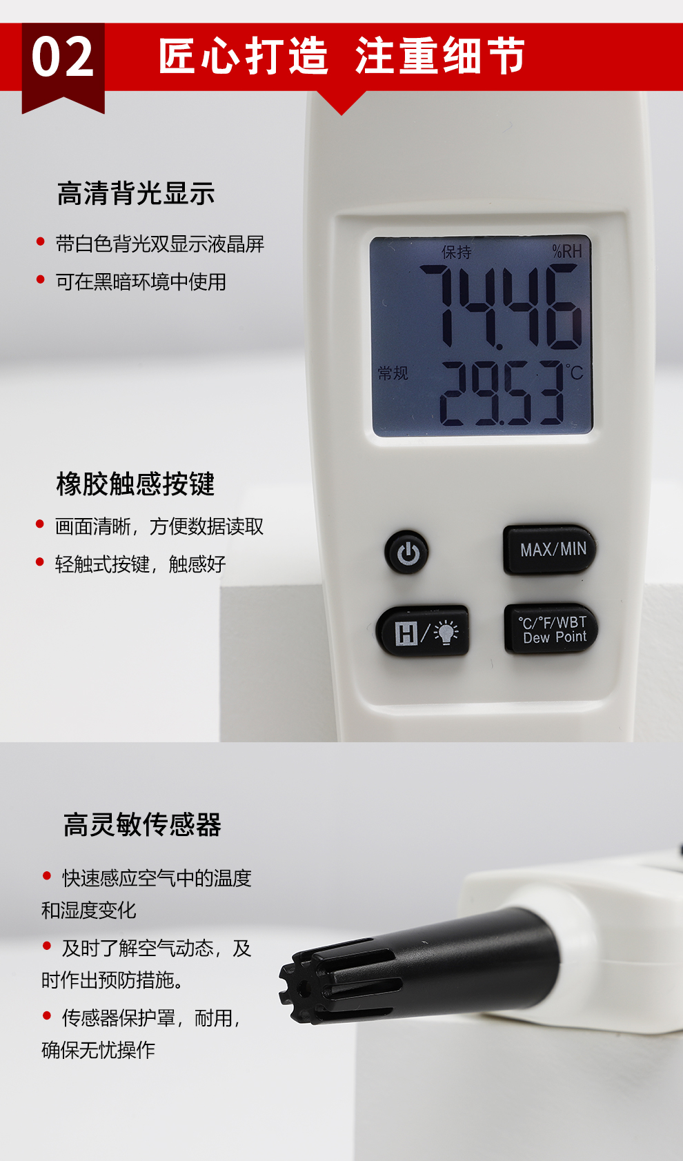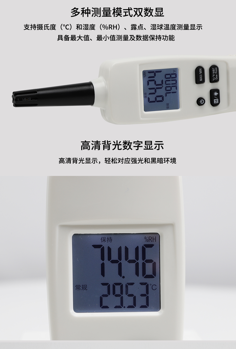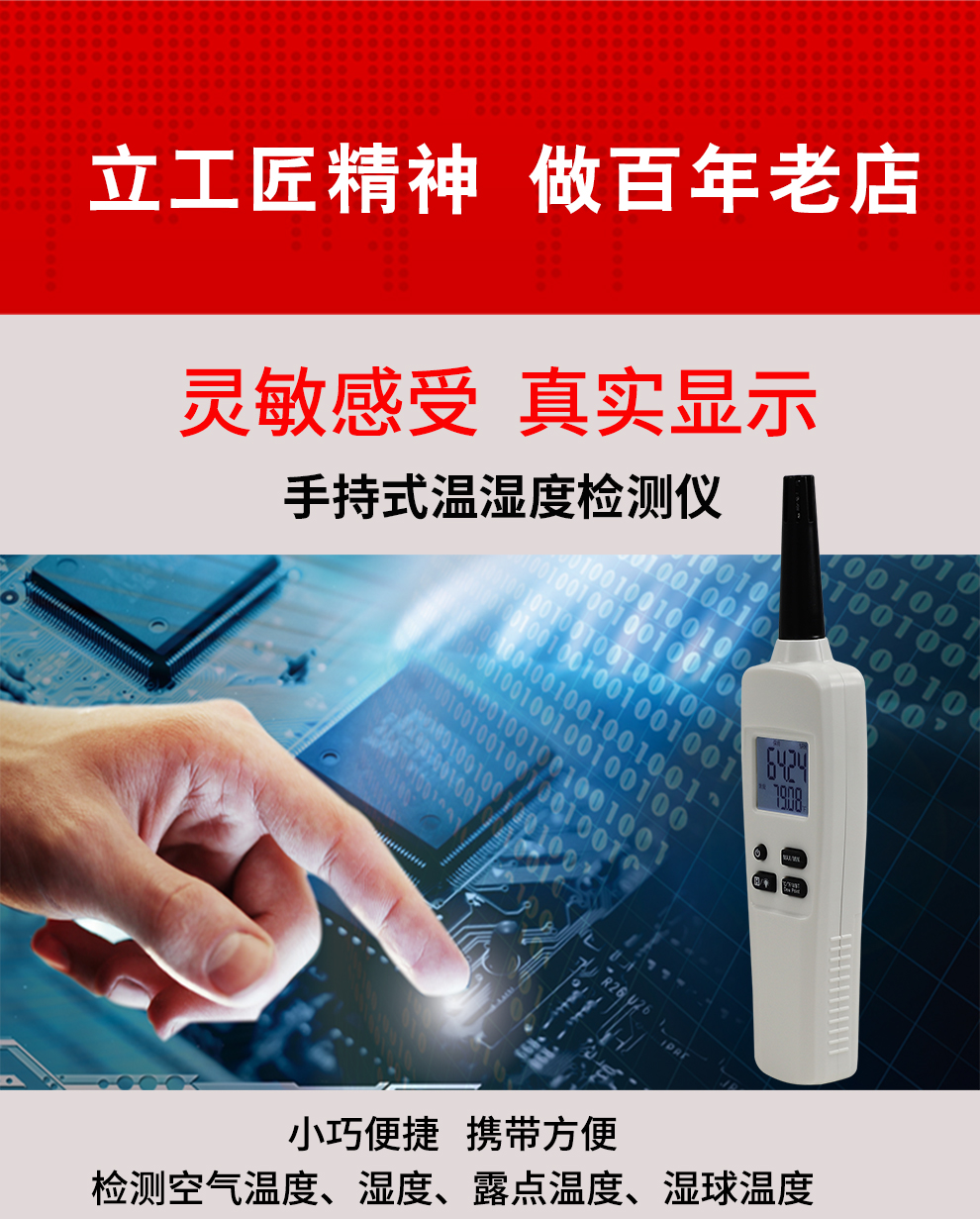 OHR-WS60系列手持式溫濕度檢測(cè)儀采用進(jìn)口空氣溫度/濕度傳感器,響應(yīng)時(shí)間快,具有空氣溫度、濕度、露點(diǎn) 溫度、濕球溫度測(cè)量功能,還具備最大值、最小值測(cè)量及數(shù)據(jù)保持功能。手持式高精度測(cè)量、小巧的外形便于攜 帶和使用,帶白色背光的雙顯示液晶屏可在黑暗環(huán)境中使用。