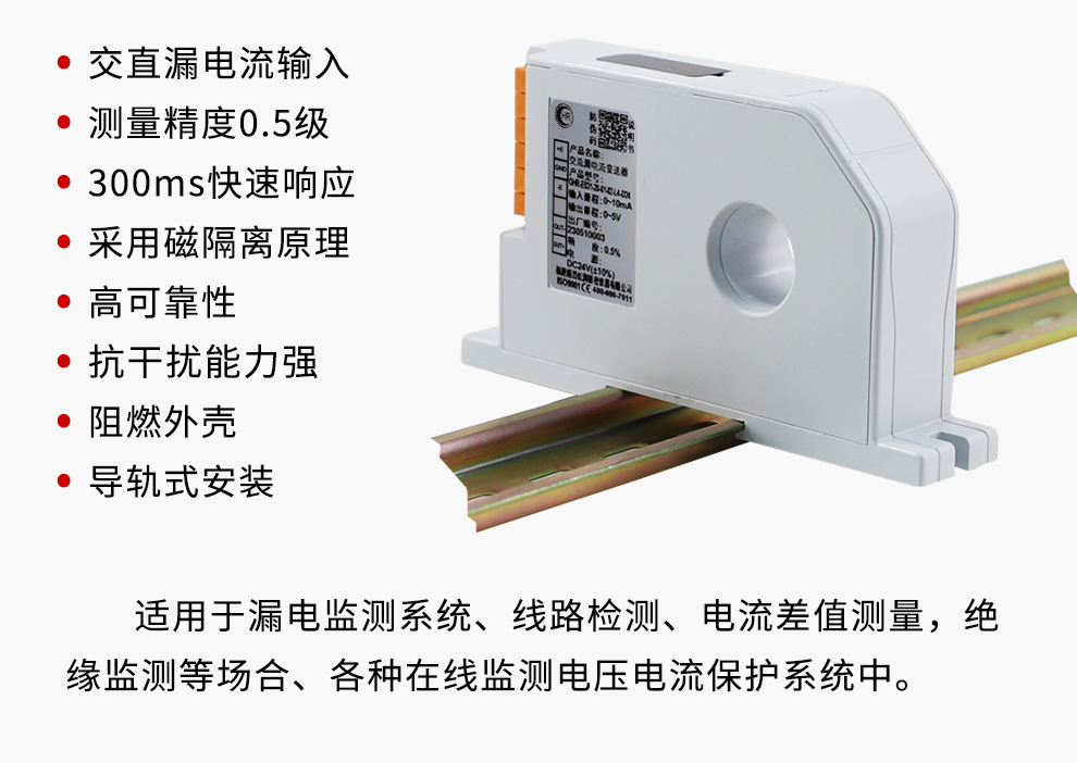 OHR-ES30系列交流/直流漏電流變送器對(duì)電網(wǎng)和電路中的交直流電流信號(hào)進(jìn)行實(shí)時(shí)測(cè)量,具有高精度、高隔離、 低漂移、低功耗、體積小、響應(yīng)快、抗干擾能力強(qiáng)等特點(diǎn)。本產(chǎn)品采用標(biāo)準(zhǔn)DIN35mm導(dǎo)軌安裝,端子接線(xiàn),安裝方 便,適用于測(cè)量漏電監(jiān)測(cè)系統(tǒng),線(xiàn)路檢測(cè),電流差值測(cè)量,絕緣監(jiān)測(cè)等場(chǎng)合。