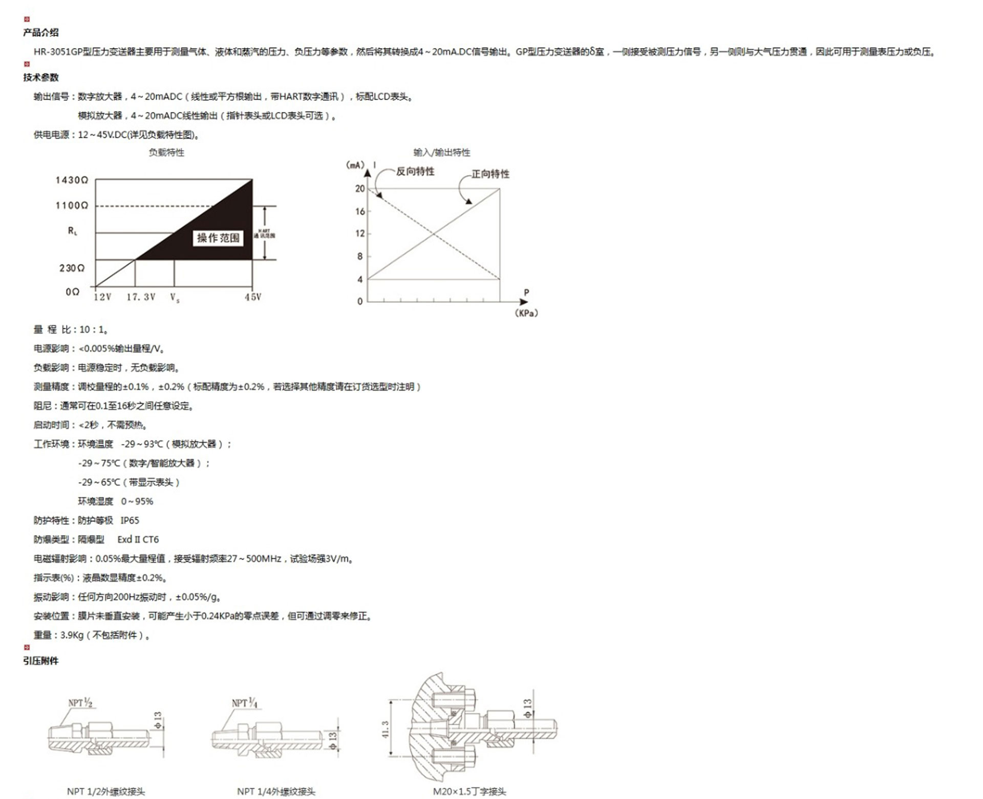 HR-3051GP型壓力變送器主要用于測(cè)量氣體、液體和蒸汽的壓力、負(fù)壓力等參數(shù),然后將其轉(zhuǎn)換成4~20mA.DC信號(hào)輸出。GP型壓力變送器的δ室,一側(cè)接受被測(cè)壓力信號(hào),另一側(cè)則與大氣壓力貫通,因此可用于測(cè)量表壓力或負(fù)壓。
