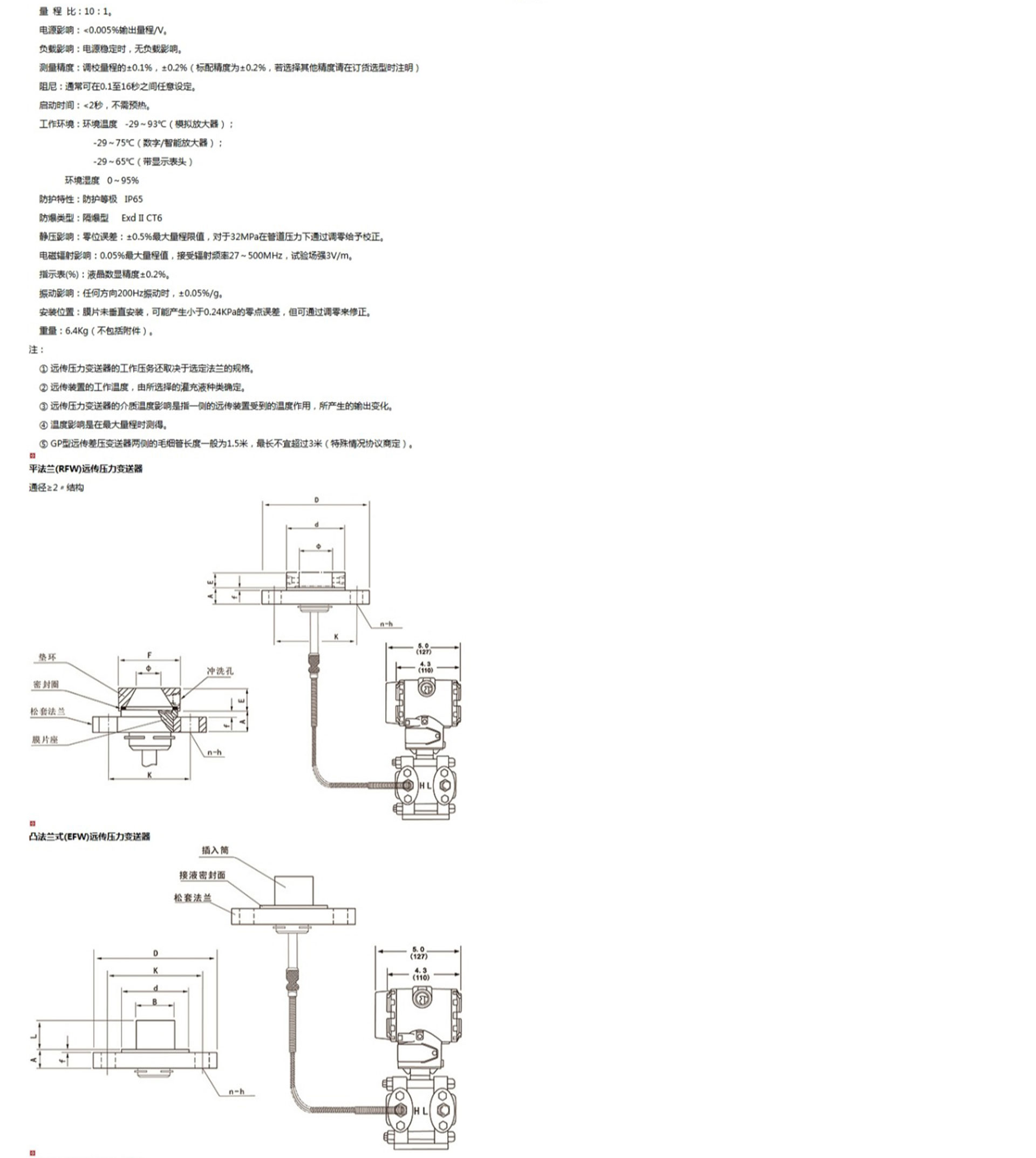 HR-3051GP遠傳壓力變送器是一種通過安裝在管道或容器上的遠傳裝置來感受被測壓力,該壓力經(jīng)毛細管內(nèi)的灌充硅油(或其它的液體)傳遞至變送器的主體,然后由變送器主體內(nèi)的δ室和放大線路板,將壓力或差壓轉(zhuǎn)換4~20mA.DC信號輸出。
