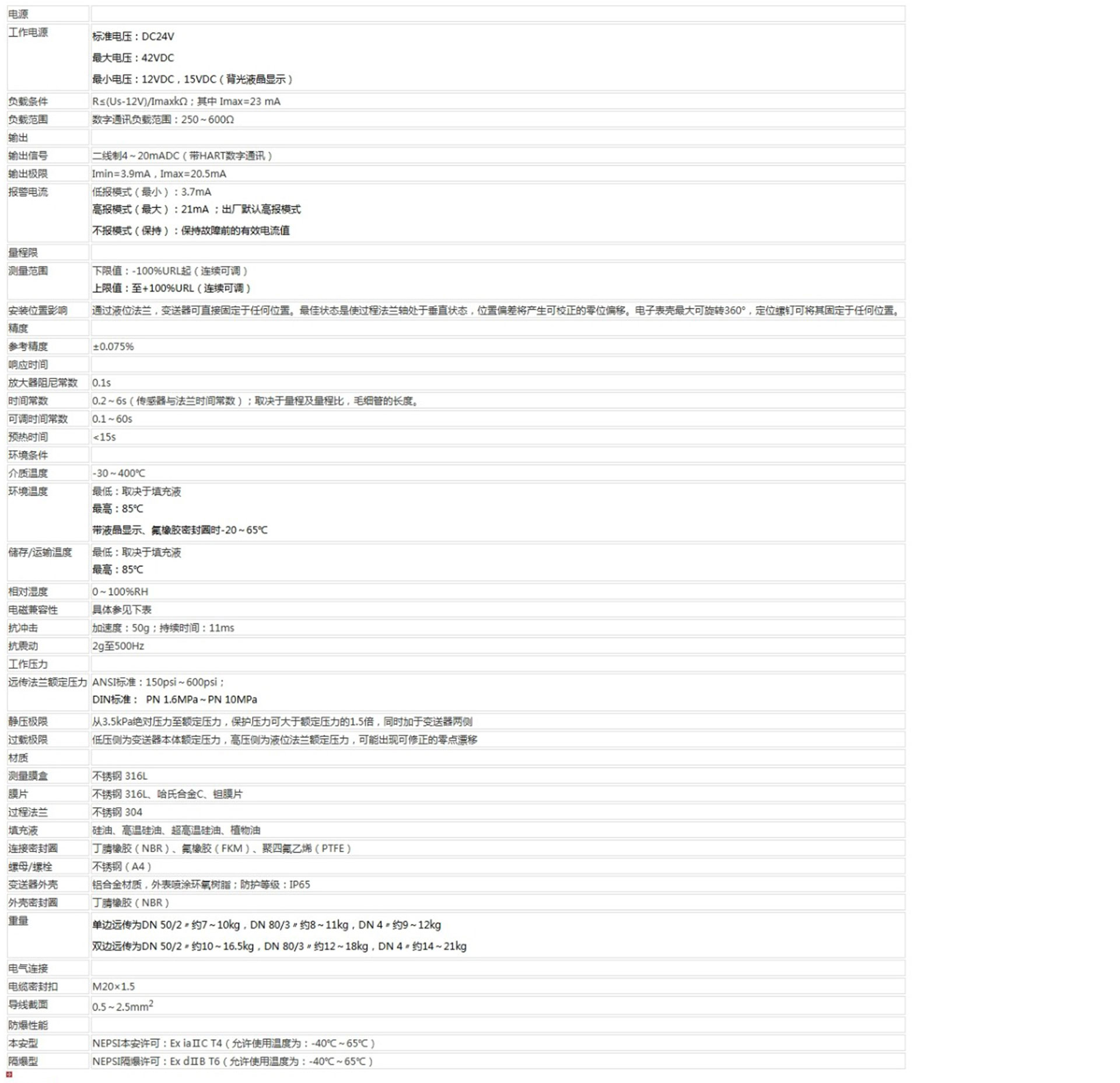 該產(chǎn)品用于測量液體、氣體或蒸汽的液位、密度、壓力,將其轉(zhuǎn)變成4~20mA (HART)電流輸出信號,可通過RST375手持終端對它們進(jìn)行參數(shù)設(shè)定、過程監(jiān)控等。測量范圍(未遷移時)為0-1kPa~2MPa,液位法蘭的額定壓力分別為:1.6/4MPa、6.4MPa、10MPa、150psi、300psi或600psi。